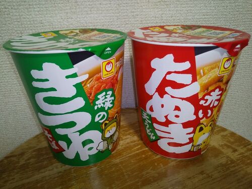 お馴染みの、♪あ~かいきつねとみどりのた~ぬ~き~♪のマルちゃんから、こんなカップ麺が発売。 おぉ、「きつね」と「たぬき」が逆だわ~。 お揚げ好きなので「緑のきつね」を選んだんだけど、「赤いたぬき」のお出汁のほうが好みだったわ~。