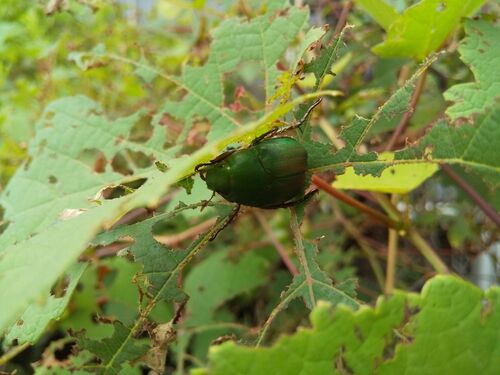 会社の駐車場の片隅にある花壇に生えているブドウ。 今日、通りがかりに何気なく見てみたら、葉っぱは無残にも食い荒らされ、ブドウの実にも1房あたり平均3匹のカナブンが、、、Σ(。。;)! ちょっと数えてみただけでも10数匹のカナブンがブドウの木に…